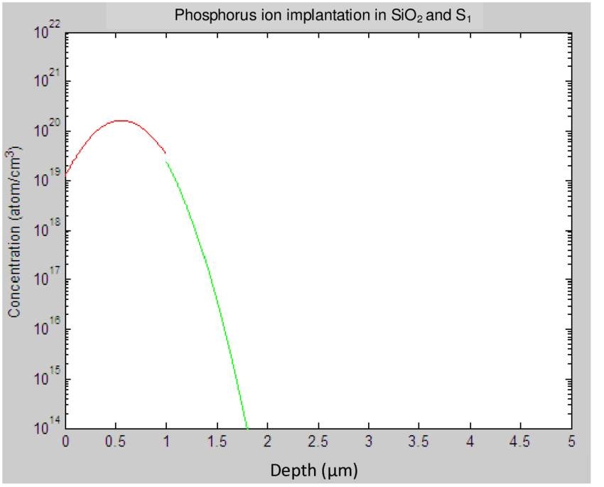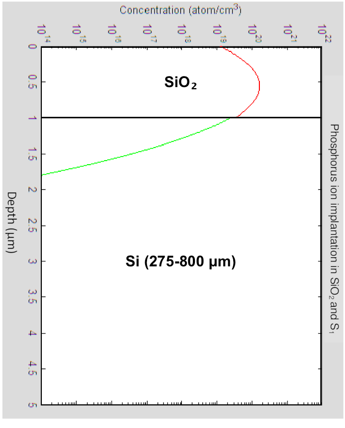 It is seen that the peak concentration occurs about halfway through the SiO2. The concentration steadily decreases from there as it exits the SiO2 and enters the Si. As seen in the graph above for range and straggle vs. energy, increasing energy will result in deeper implants and a shifting of the Gaussian curve to the right, while also flattening it due to increased straggle.