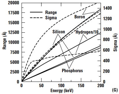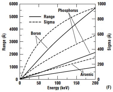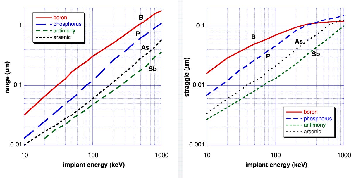 Desired junction depth can be achieved by choosing the energy and species based off their range and straggle values: