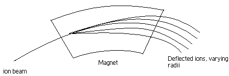 Where B is the magnetic field strength, m is the species’ mass, Vext is the extracting voltage, v=2qVextm is the ion velocity, and q is the species’ charge. Depending on the species’ mass, some may go less than, equal to, or greater than the desired angle.