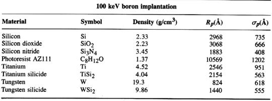 If the photoresist mask has been ruled out, the other two options are dielectric, such as SiO2 or Si3N4, or metals, such as Ti, W, or silicides of either (TiSi2, WSi2). Range and straggle of the implanted species into the selected material should be chosen. Denser materials are obviously better masks.