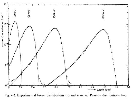 The N(x) equation above is a simple Gaussian function, but is not entirely representative of how actual implant profiles look. To better simulate real profiles, the Pearson IV distribution and moments are used, which accommodate for the skewness that often occurs.