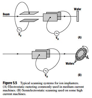 In electrostatic scanning, variable electric fields in both the x and y direction scan the beam across a stationary wafer. This requires a narrow beam, which is generally given by low dose and low current implants. Electrostatic scanning is avoided on high current tools because the beam tends to expand with higher currents, causing poor scanning control. The tilt angle will also vary as the beam scans over the wafer, causing channeling and uniformity issues.