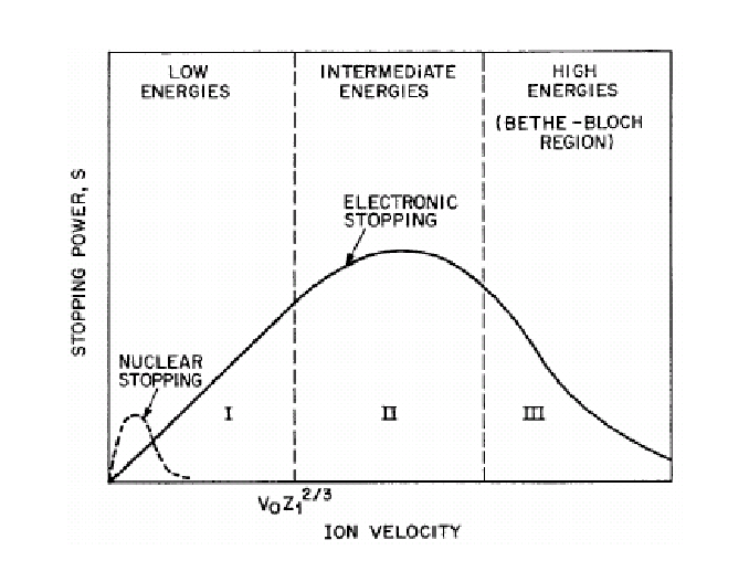 High velocity ions slow down primarily due to electronic stopping. Their collisions with substrate atoms are highly inelastic. Electronic stopping dominates at moderate energies.