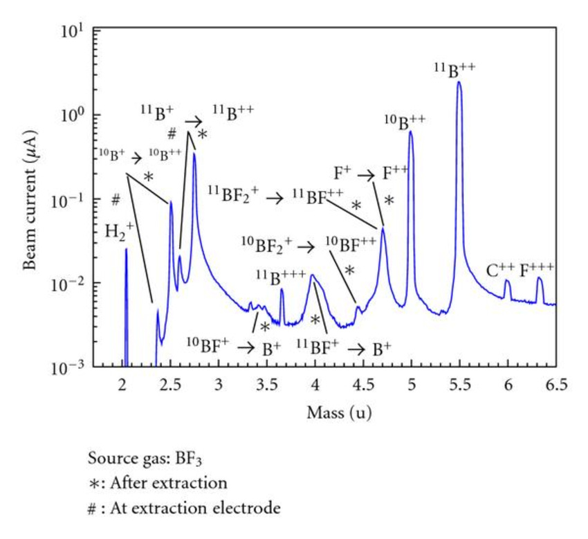 Multiple ions can form from the same source gas. For example, BF3 may ionize into 10B+, 11B+, 10BF+, 11BF+, F2+, 10BF2+, and 11BF2+. To find the relative percentage of each in the plasma, the gas spectrum, which shows the beam current vs. atomic masses, needs to be analyzed.