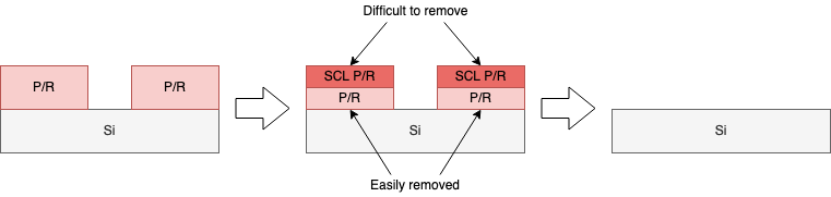 High energies can cause strong cross-linking of the resist, making removal more difficult than normal. However, because high-energy ions don’t make it to the bottom of the resist, a lift-off process can be performed to more easily remove the strongly-cross-linked parts of the resist.